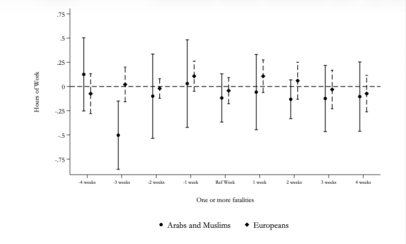Abstract: This paper shows that members of a disfavored group adjust their economic behavior in response to prejudice. We exploit localized increases in anti-Arab and anti-Muslim sentiment triggered by combat fatalities of U.S. service members during the wars in Afghanistan and Iraq (2001–2014). Following a home-state fatality, Arab and Muslim men reduce weekly hours worked by about 1 percent. The decline reaches 3.7 percent during multiple-fatality weeks among the self-employed and workers in interactive occupations. These responses coincide with short-lived increases in anti-Muslim hate crimes. Our findings indicate that prejudice distorts market outcomes by inducing targeted individuals to withdraw from economic interactions.